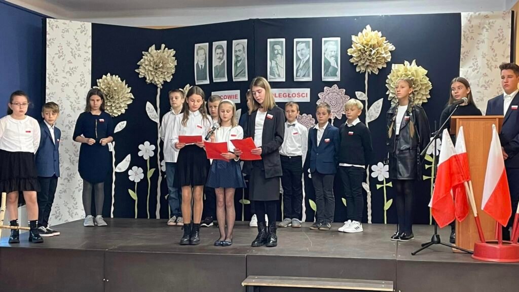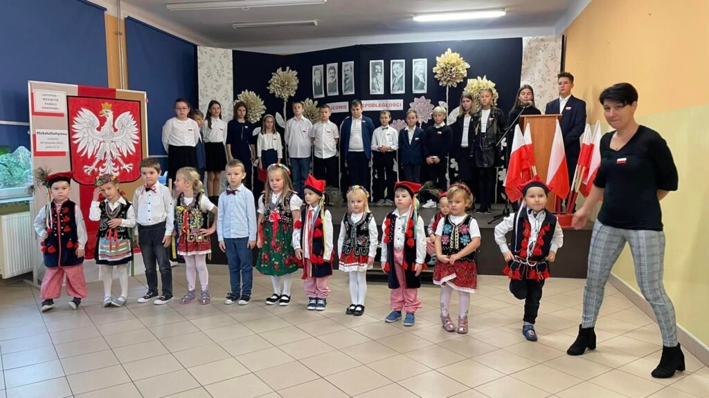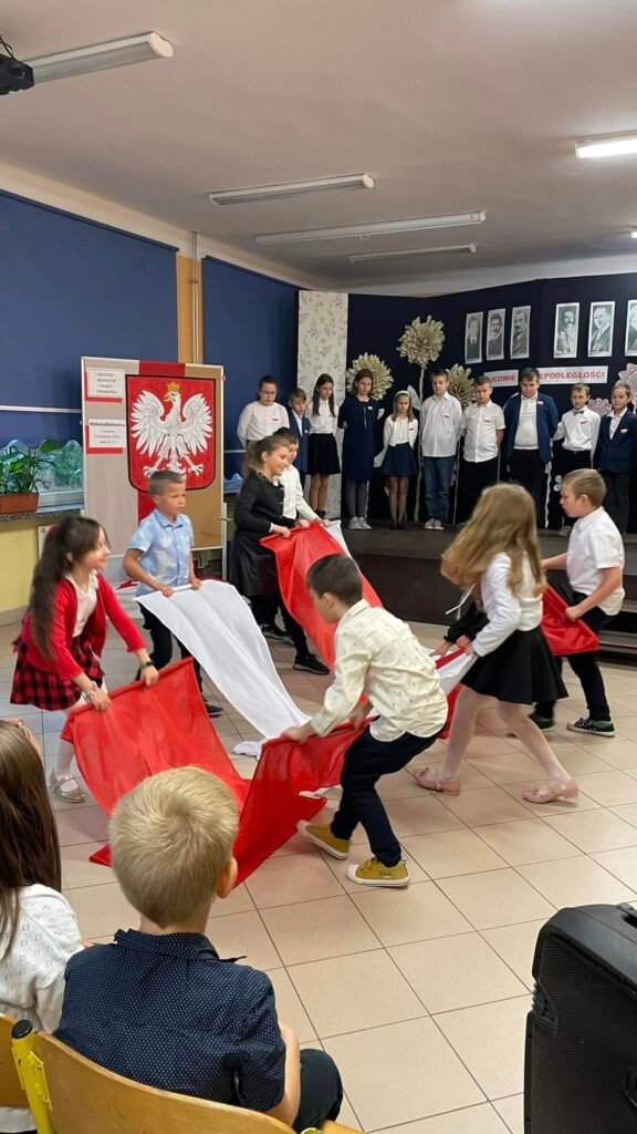 w uroczystej akademii przedstawili krótki rys historyczny dotyczący wydarzeń związanych z Odzyskaniem Niepodległości. Uczniowie z klasy III zaprezentowali piękny taniec z flagami, przedszkolaki zaszczyciły nas swoim ,,Krakowiakiem”, a uczennica klasy VIII zachwyciła swoim śpiewem pieśni patriotycznych.