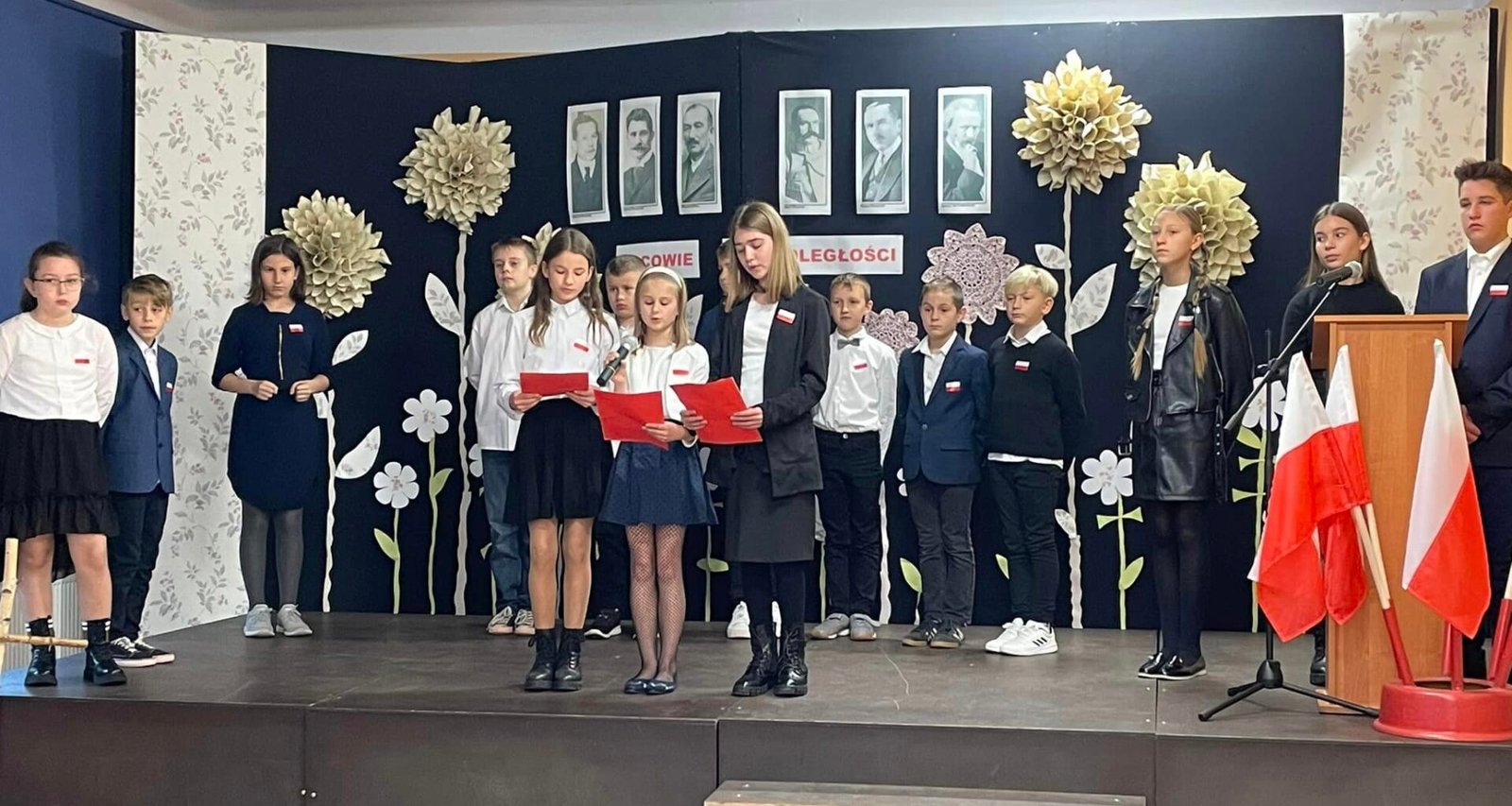 w uroczystej akademii przedstawili krótki rys historyczny dotyczący wydarzeń związanych z Odzyskaniem Niepodległości. Uczniowie z klasy III zaprezentowali piękny taniec z flagami, przedszkolaki zaszczyciły nas swoim ,,Krakowiakiem”, a uczennica klasy VIII zachwyciła swoim śpiewem pieśni patriotycznych.