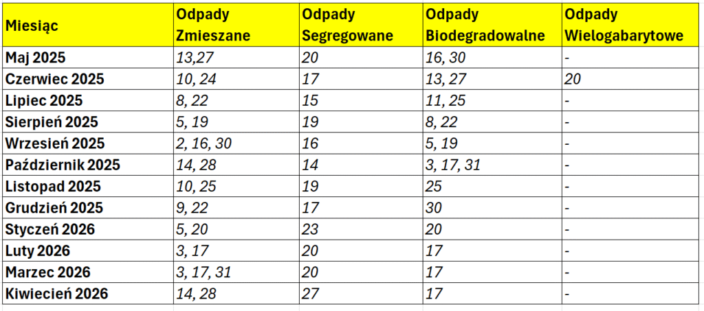 Odpady prosimy wystawiać do godziny 6:00 rano w widocznym miejscu przed teren posesji.